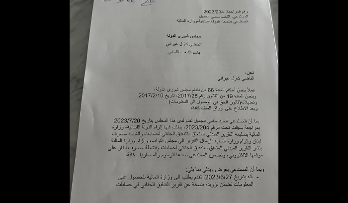 وكان النائب سامي الجميّل قد تقدّم، بواسطة وكيلته المحامية لارا سعادة، بمراجعة أمام مجلس شورى الدولة لإلزام وزير المال تسليمه التقرير المبدئي للتدقيق الجنائي الذي أنجزته شركة “ألفاريز أند مارسال” في حسابات وأنشطة مصرف لبنان.