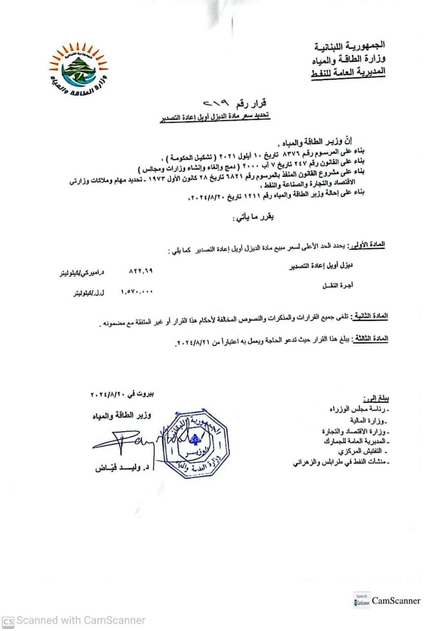 حددت وزارة الطاقة في بيان، سعر مادة ديزل أويل (إعادة التصدير) للسفن بـ 822,69 اضافة الى أجرة النقل بمليون و570 ألف ليرة لبنانية.