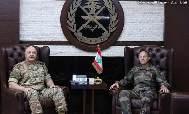 استقبل قائد الجيش العماد جوزاف عون في مكتبه في اليرزة، نائب رئيس أركان الجيش الفرنسي للعمليات الجنرال Thierry Garreta، وجرى التداول في سبل تعزيز التعاون بين جيشَي البلدَين، وتناول البحث الأوضاع العامة في لبنان والمنطقة والتطورات عند الحدود الجنوبية.