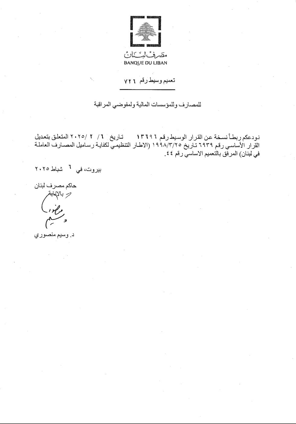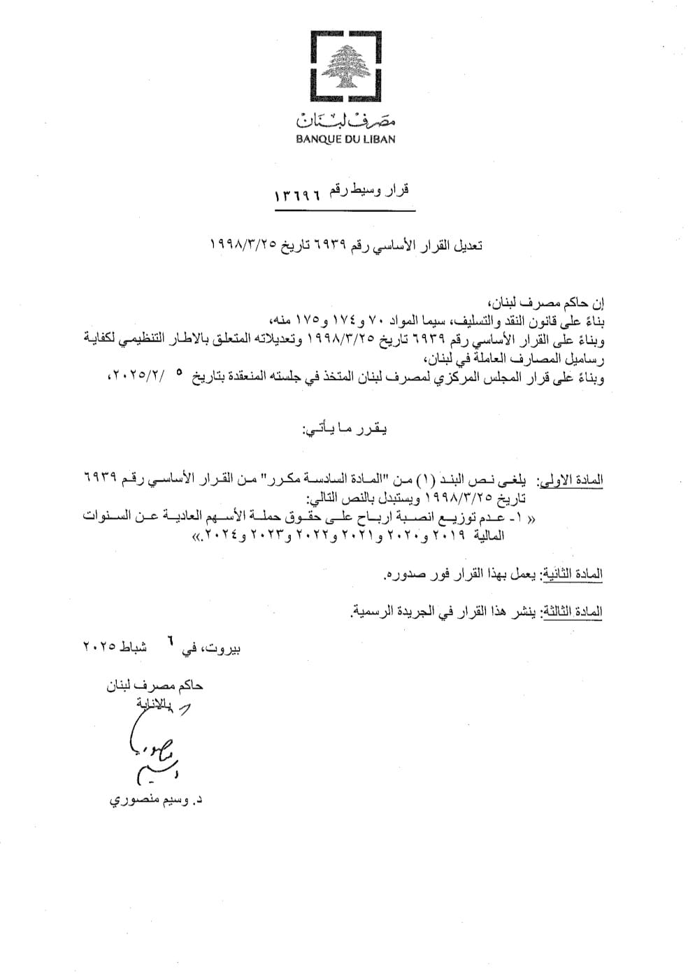 أصدر حاكم مصرف لبنان بالإنابة وسيم منصوري تعميماً للمصارف، وتعميماً ثانياً للمؤسسات المالية، منع بموجبهما توزيع أنصبة أرباح عن السنوات من 2019 الى اليوم.